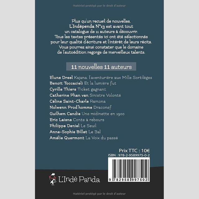 Plus qu’un recueil de nouvelles, L’Indé Panda n° 13 est avant tout un catalogue de 11 auteurs à découvrir. Tous les textes présentés ici ont été sélectionnés pour leur qualité d’écriture et l’intérêt de leurs récits. Vous pourrez ainsi constater que le domaine de l’autoédition regorge de merveilleux talents.